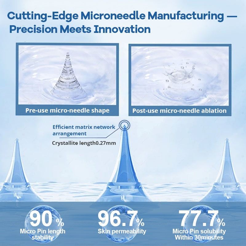 Each needle is 0.27mm long. just 1/7th the thickness of a hair. and is made from dissolvable medication. These micro-needles are precision-engineered using cutting-edge manufacturing techniques to ensure a seamless. pain-free experience while effectively delivering the active ingredients directly into the skin.